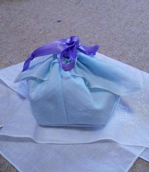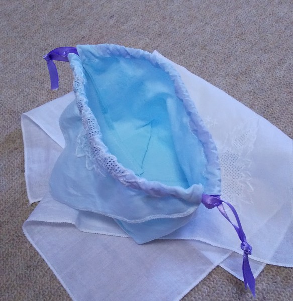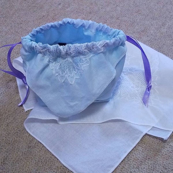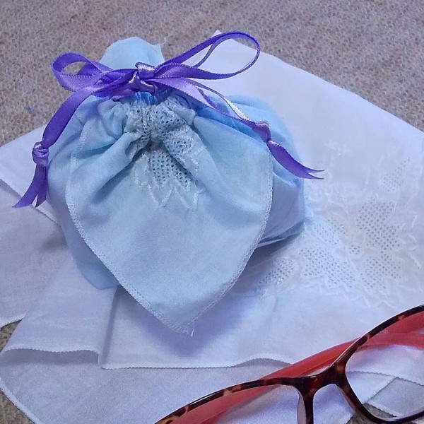 刺繍入りハンカチを使う機会がないので、巾着にしました。