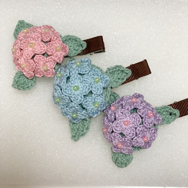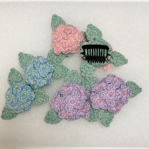 あじさいの土台に中綿を入れドーム型にすると同時に葉も編み入れ、お花は一つ一つ編んで貼り付けです。
