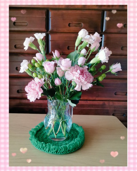 素敵なお花の贈り物を飾るためのドイリーを手紡ぎ糸で編みました。