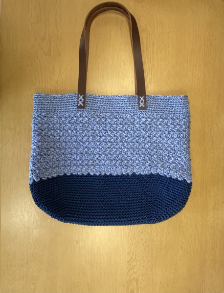 YouTube LiLi nanaさんの動画を参考に作った底がマクラメヤーンになっているバッグです。革の持ち手をつけました。少し前に作ったバッグで、編み物グッズを入れて持ち運んでます。