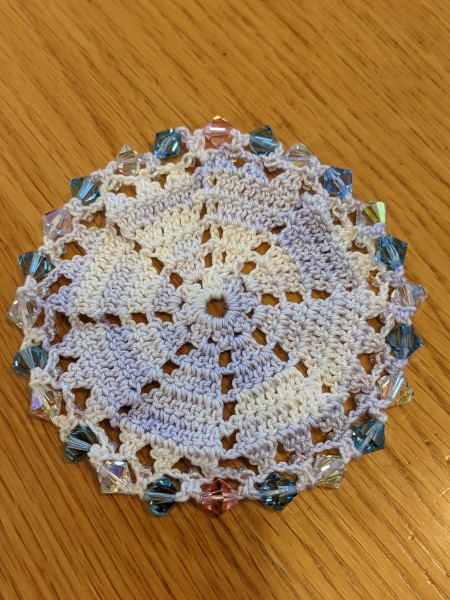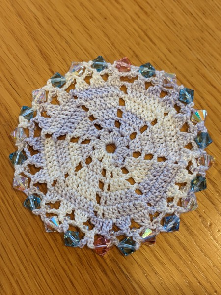 | レース編みもしたことないのに「ビーズで彩るレース編み」を一目惚れで購入。いつか作りたいと思い十数年が経ってました。最近になって動画でレース編みを練習して、ようやくの初作品。 十数年も経てば事情も変わるもので、スワロフスキー社がビーズ事業から撤退とのこと。お店に行っても在庫限りで、ビーズ集めに少し苦労しました。 ビーズが入ることでレース編みもグッと華やかさが増すような気がします。しばらくは、この本の中から作ってみようかなぁ。 |