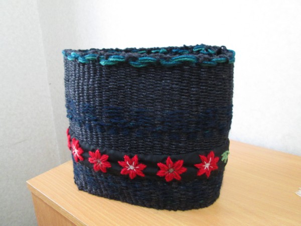 全体を黒でシックにまとめ、毛糸を織り込み赤のウール刺繡をした布を巻き付けて、さらに上部分に青緑の麻ひもをアクセントに加えて暖かみのある大人可愛いバッグに仕上げました。