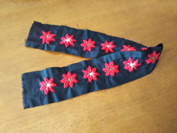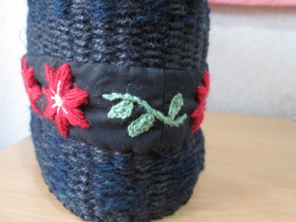 黒の布地に赤の毛糸で花模様の刺繡をして、バッグに縫い付けました。