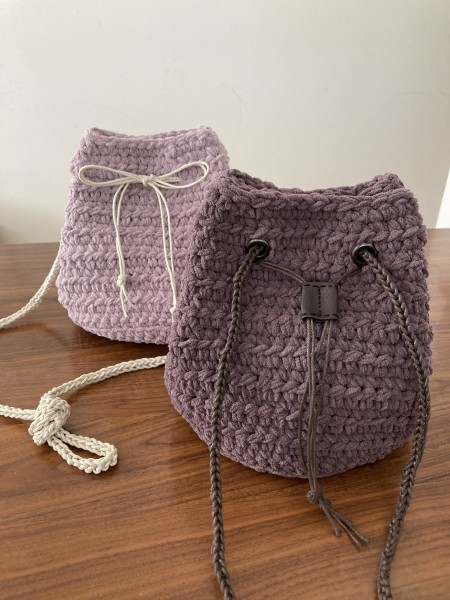 | 巾着バッグ。楽しすぎて色違いで製作してみました。濃い方は、自分用で薄い方は子ども用。子どもの方は白のワックスコードがアクセントになって、リボン結びにすると可愛いです。 | |