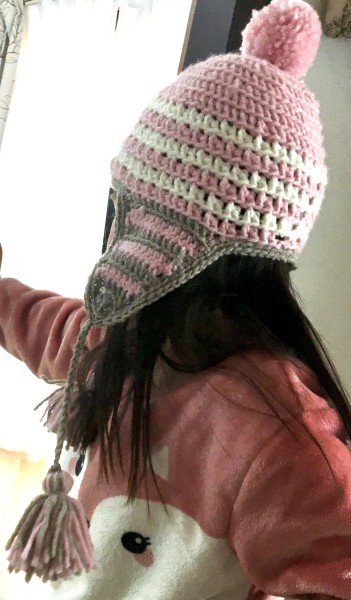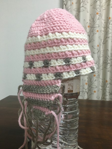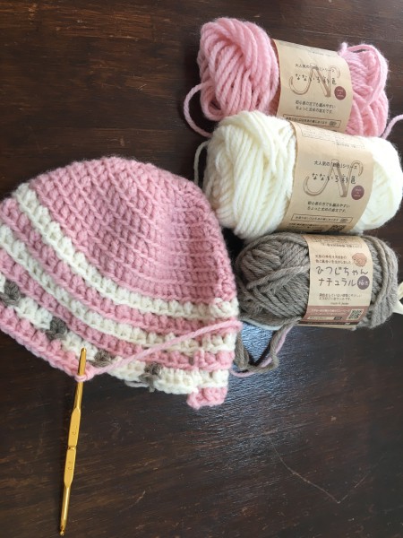 | 製作途中の写真は7号で編んでいたのですが、帽子のサイズが小さくて、なおかつブラウンの毛糸のデザインが気に入らなくて全部解いてやり直しました。 かぎ針を8号に変えて、目数を本通りに間違えずに編むことで(基本中の基本が出来てなかった涙)、目的のサイズの帽子を編むことが出来ました。 でも配色はどうしても編んでみないと雰囲気が分かりませんね。 |