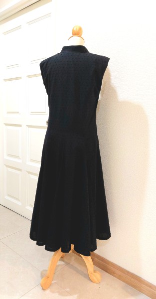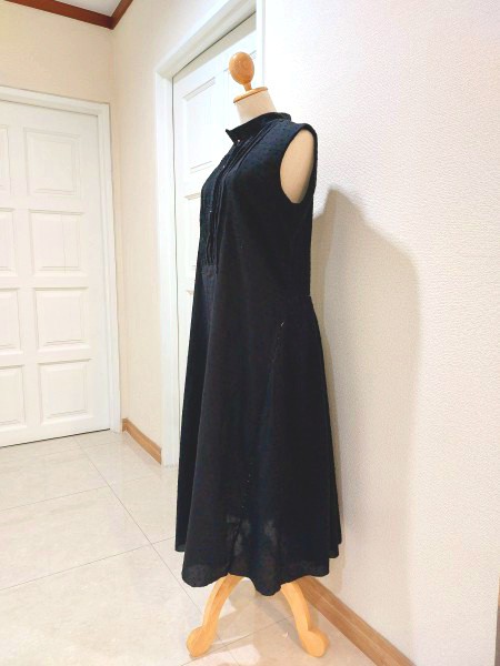 | 胸にピンタックが入ったノースリーブワンピースです。 以前に洋裁教室で作ったワンピースのおさらいで別布で作り始めました。 ピンタック部分と袖が難しかったです。 |