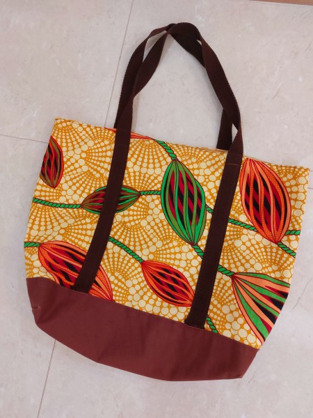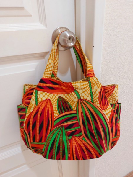アフリカ布で大きなトートバックとポケットが両サイドについたバックを作りました。