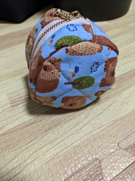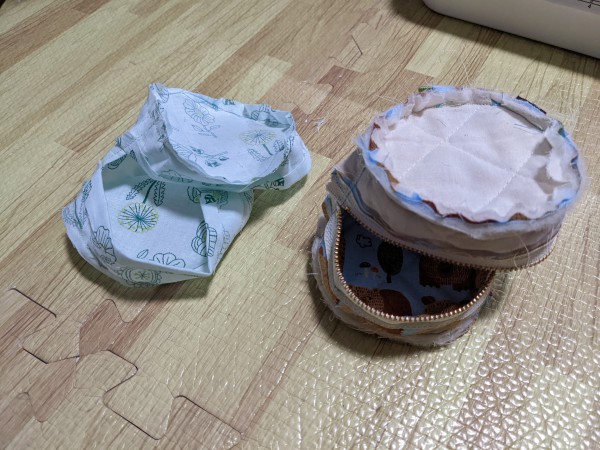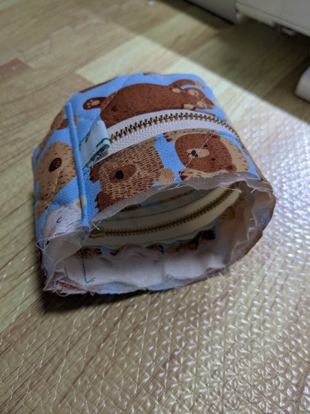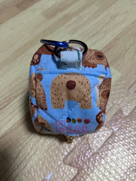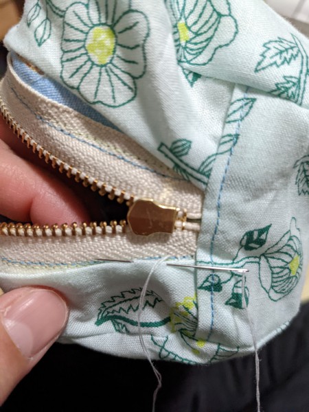 ファスナー付けました! バッグに付けられるよう、カラビナをつけるためのタブも作りました。 明日はミシンお休みデーなので、明後日完成かな?