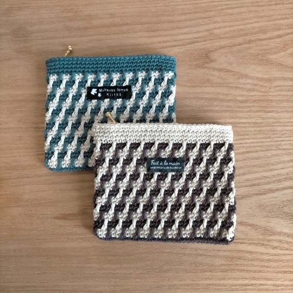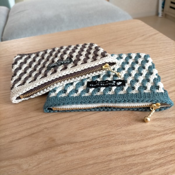模様編みのミニポーチです。ストライプっぽい階段模様が気に入っています。