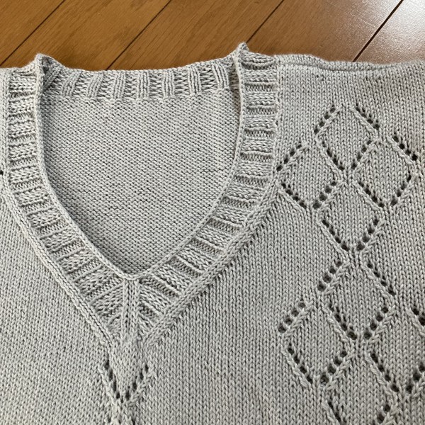 これからの季節に着たいと思って編みました。襟元がVなので下にキャミソールを着ても…。おしりが隠れる長めの丈です。もっとAラインのシルエットにしたかったのですが、そこは中途半端になってしまいました。