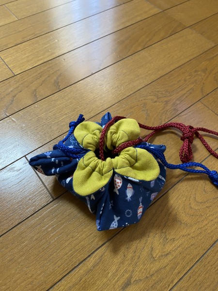 裏面は折り伏せ縫いにし、巾着も肩がけが出来るように紐を付けました。