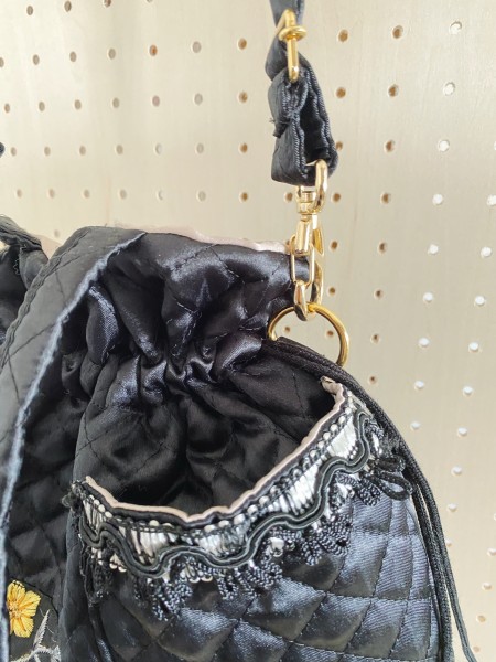 | 母の誕生日にあげるため作りました。大人っぽいけど可愛らしさも出るように意識して素材を選びました。ベースはサテンのキルティングで少し艶っぽくし、刺繍のブレードを計4種類使って可愛らしさと個性を出しています。 巾着型できゅっと絞れるけどスマホなどはすぐに取り出せるように外側に二つ大きなポケットをつけています。 中にはウィリアムモリスの布で作ったポケットをつけています。 色んな持ち方が出来るようにしたかったので、取り外しが出来るショルダー紐もつけました。肩にかけた時の負担が少なくなるように同じキルティング素材を使っています。 工程が多く大変でしたが、概ね想像通りの出来になり満足しています。 |