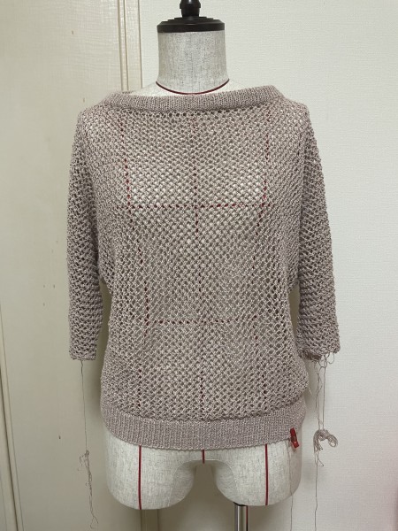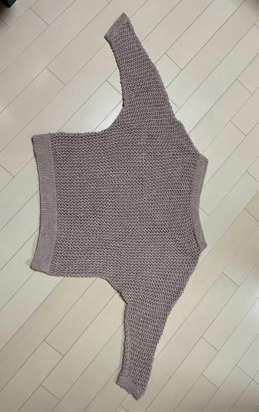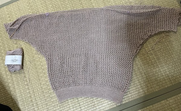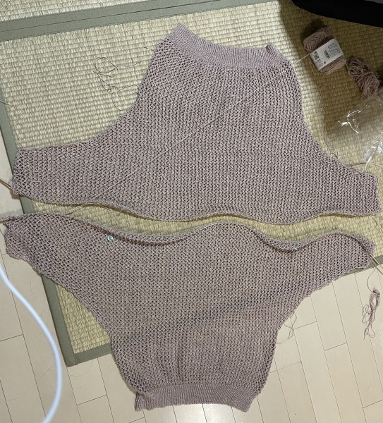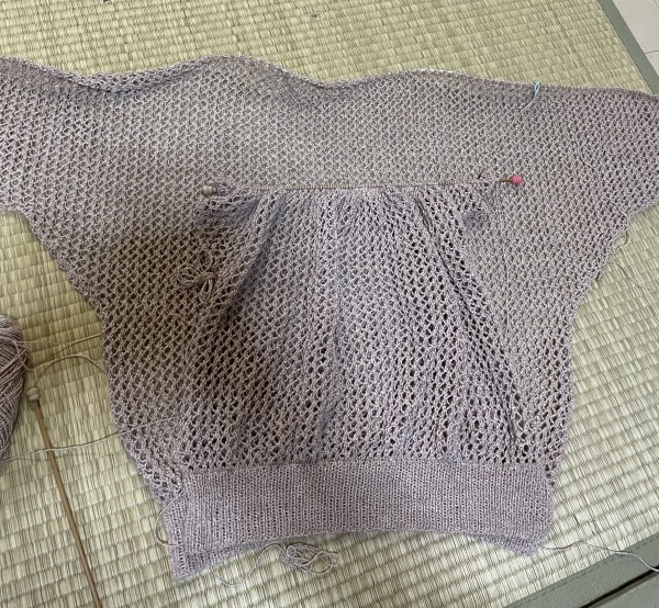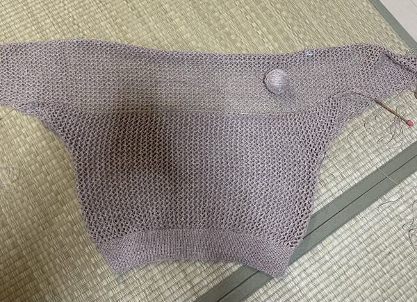 あれから編んでは間違えて解きを繰り返して、ようやく前身頃完成。゚(゚´ω`゚)゚。
