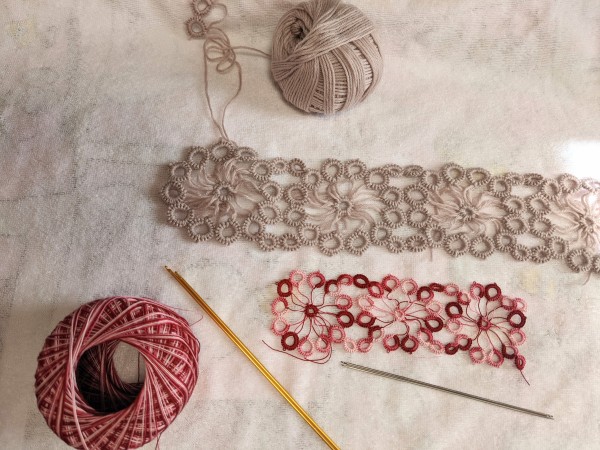 課題は毛糸を使用。同時にレース糸でも平行作業。