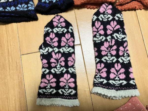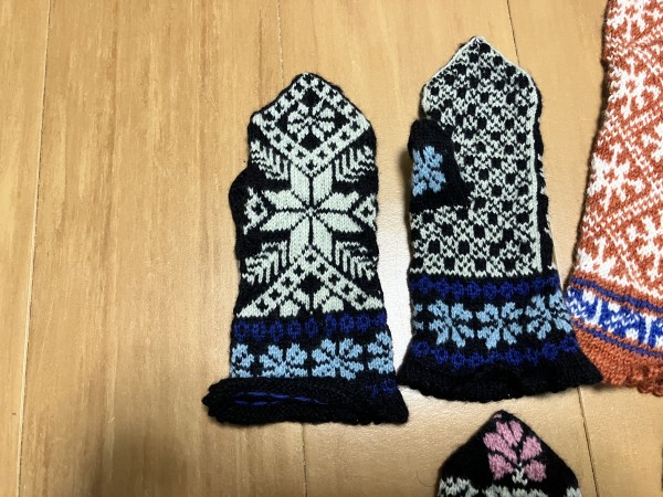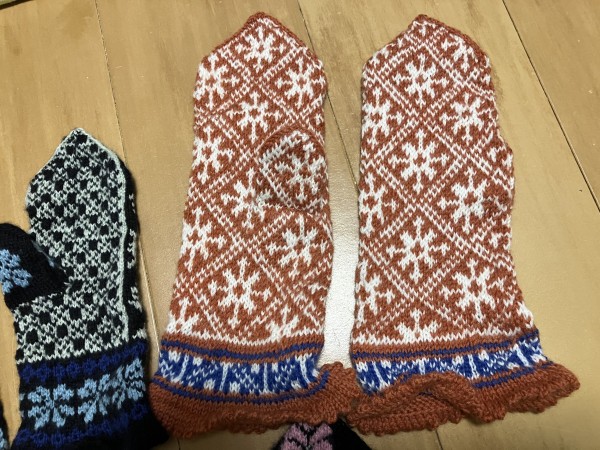| プレゼント用にラトビアンミトンを編みました 使う人の手のサイズに合わせるため、赤茶のミトンは中細毛糸で3号針、他二つは極細毛糸2本どりで1号針で編んでいます 失敗した点 赤茶のミトンはサイズを大きくするのに毛糸の太さを変えたため、全体が長くなってしまいました 手側の調整はしたのですが手首側は出来ませんでした |