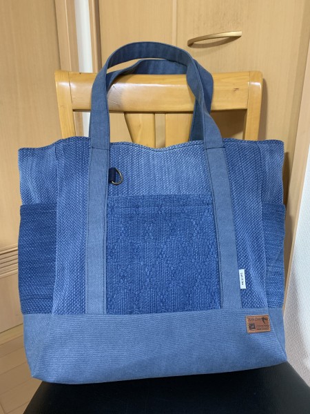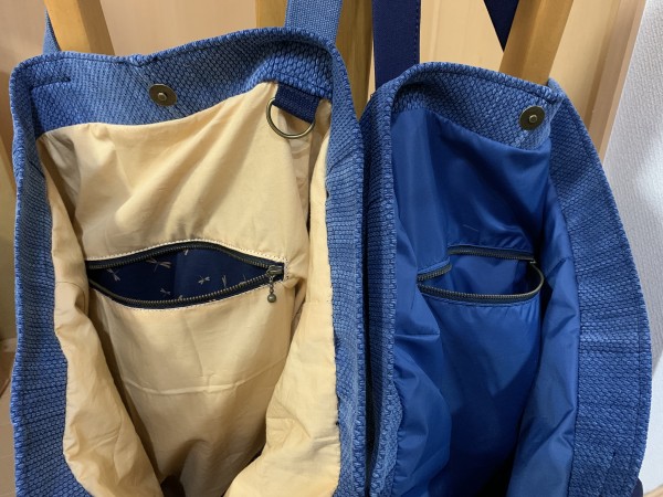 | 帆布✖️剣道の道着 ふたつの素材を使って同時に2つのトートバッグを作成しました。 帆布は濃紺とくすみブルーを使用。 表に3個のポケット、裏にファスナー付きのポケットをつけました。 クリーム色の裏地の内ポケットには剣道にゆかりのあるトンボ柄を忍ばせました。 |