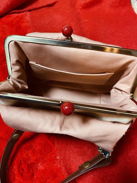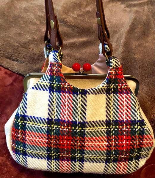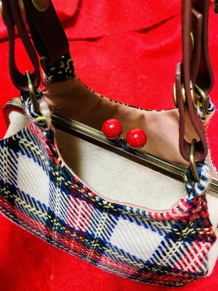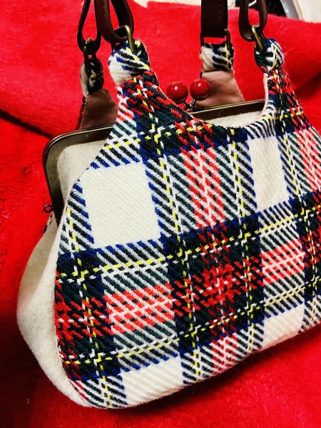 あったかウール素材のチェックと厚みのあるフランネルの白でがま口バックを作りました。赤玉の口金がチャームポイントです。