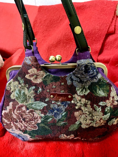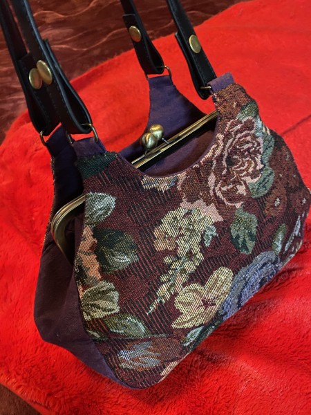 ジャガード生地とリネンであおりがま口バックです。母への贈り物にするつもりです。