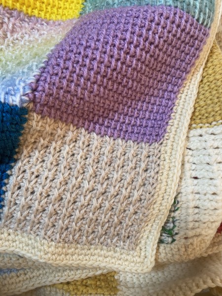 8号のアフガン針で色を変えながら模様編みも入れて編みました。