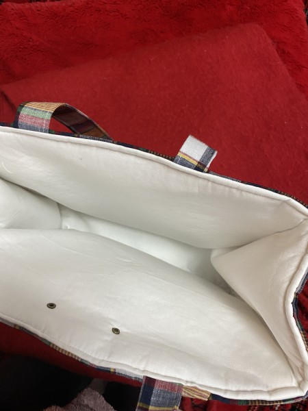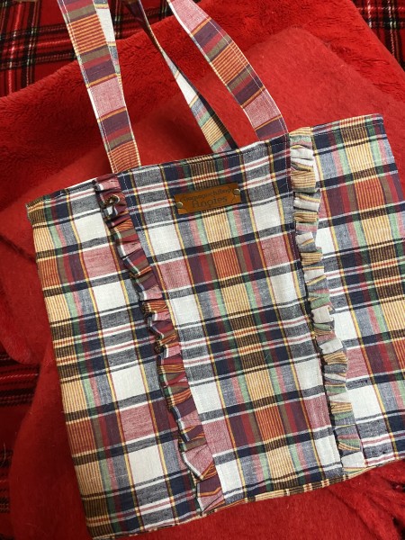 猫さんの画像からオリジナルの刺繍をして、マドラスチェックのフリルトートバックを作り合わせてみました。革のロゴもオリジナルでつけてみました。