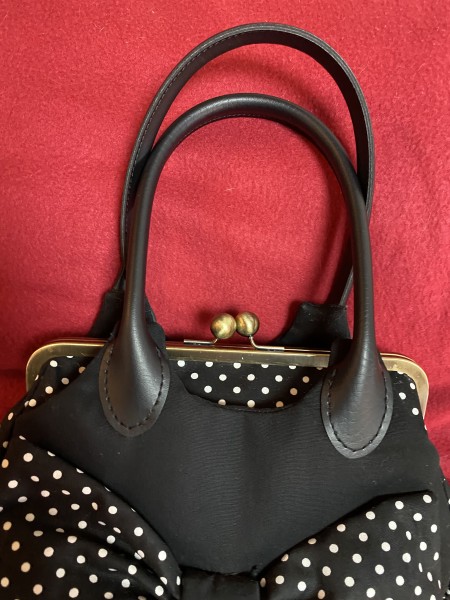 黒ドットのがま口バックです。お揃いでがま口も作りました。春コートが赤と黒ドットのリバーシブルなので、黒ドットの時用に作りました。