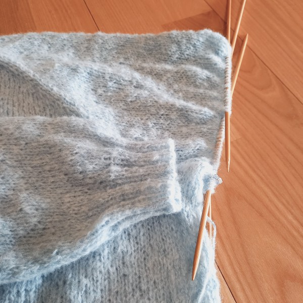 身頃が編み上がったので、袖を編み始めました。長い輪針を持っていないので、今は少数派の4本針で編んでいきます。でも、実はマジックループは