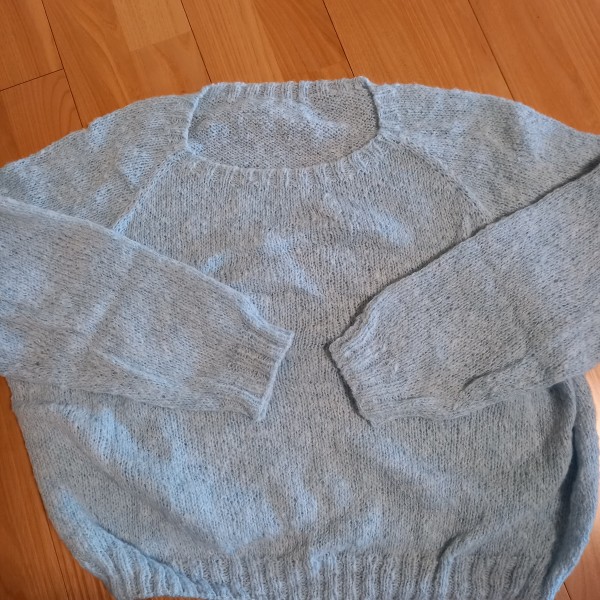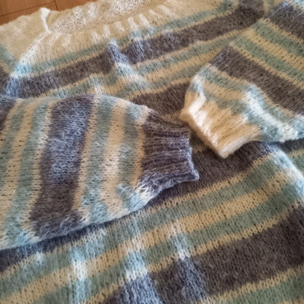 もう少し細いストライプで編んでいたのですが、糸を変えるときにうまくいかないのと、柄がちょっと違うな…と思って、この変則的なストライプに変えました。あと少し…ってところで白が足りなくなったので、ゴム編みをあきらめてネイビーに変えました。まぁ、白だと袖丈が短かったので、ネイビーにして良かったかな…。白いほうをほどいて、編み直して完成です。