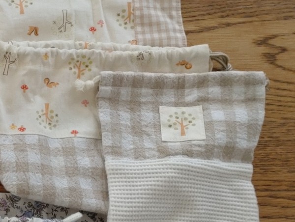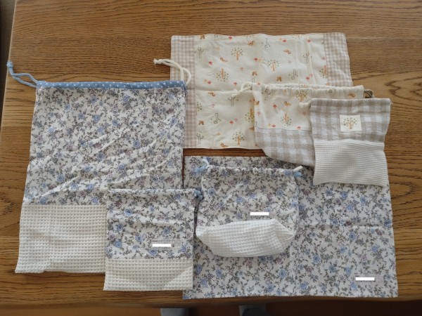 | 久々のミシンです! 娘に頼まれて、孫の入園に合わせて幼稚園グッズを作りました。 大きさと形や、バッグと座布団と靴入れはキルティングとの指定通り作ってます。 キルティング以外は家に貯めていたハギレを活用して着替え入れ、弁当袋とナフキン、コップ入れ等も作りました。 タグやレースやヒモも有るものをフル活用(*^^*) 同じ布が足りず(ベージュ系の木の模様)模様を切り取ってタグのように縫い付けてワンポイントにもしたりもしました。これだけで、ちょっとお揃いの様に見える?(^_^;) |