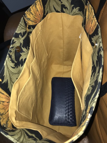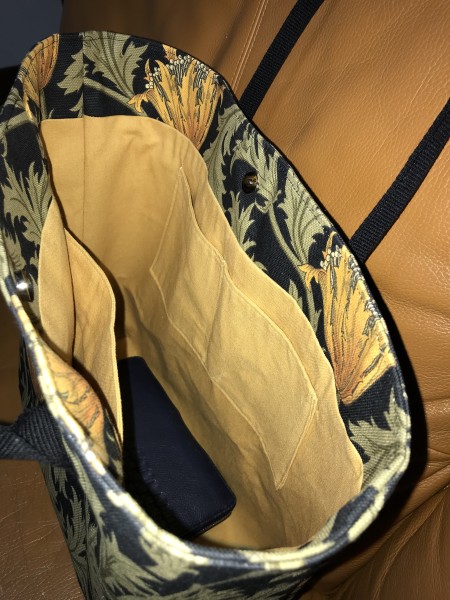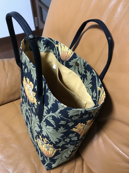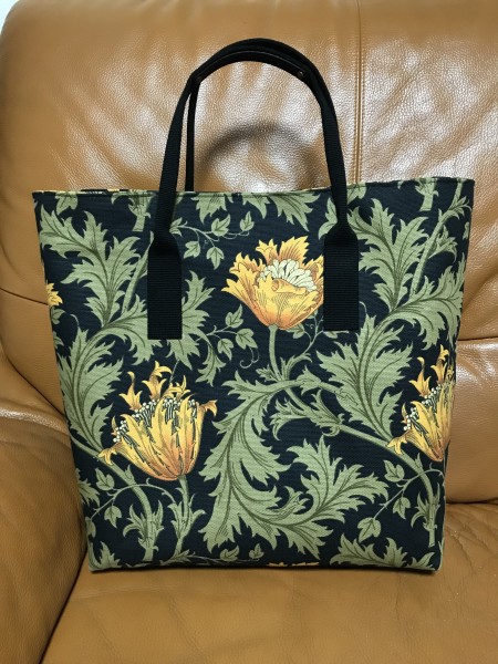 ウィリアムモーリスのお気に入りの生地でトートバッグを作成。高級感のある雰囲気を目指しました。大きめで買い物してもたくさん入るからエコバッグ要らず。