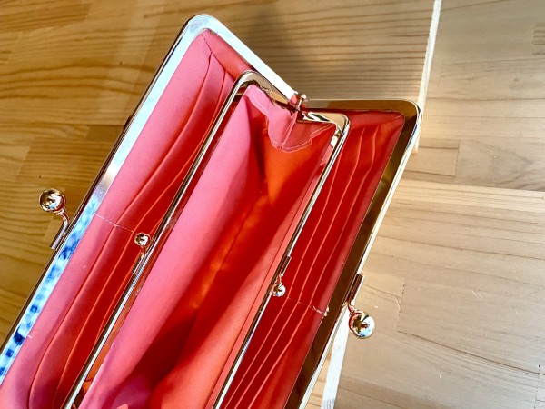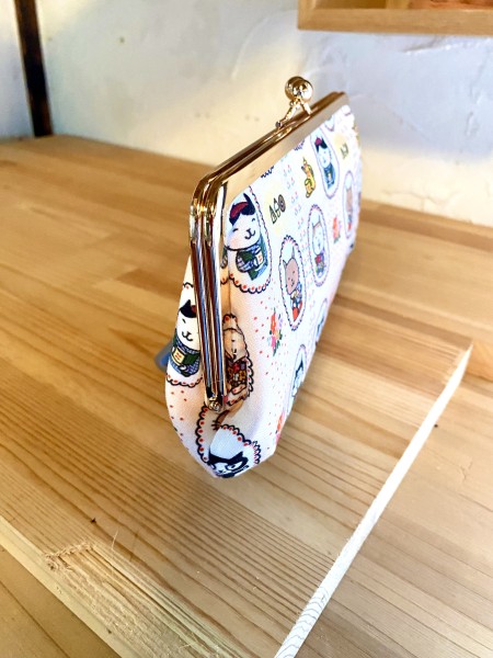 オリジナルデザインの布の第二弾で憧れの長財布チャレンジしました。親子がま口なので、中にもがま口があります。ポケット2つにカードポケット12個。パチンっと締まって気持ちいい。福も逃げなさそう。