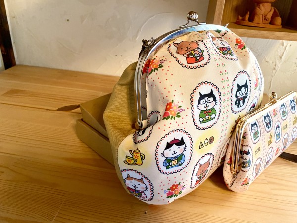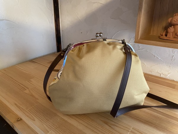 オリジナルの布第二弾を使ってふっくら大きながま口ショルダーバックを作りました。ペットボトルも長財布も楽々入ります。布は撥水加工されたものなので、汚れに強く埃もよせつけません。