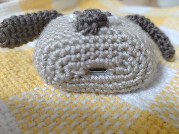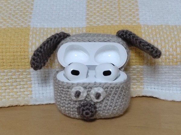 | 娘から こんな感じで作れない?と見せられたairpodsのケースを作ってみました。 ちょっとうちの犬に似せた 垂れ耳のワンちゃんのイヤホンケースですU^ェ^U ケース本体は簡単にできたんだけど、顔のパーツが小さいし、バランスがなかなか難しくて苦労しました。 見本では目と鼻はフェルトだったけど、全部残り糸で再現。 ちゃんと充電用の穴も開いてるのでそのまま充電できます。 気に入って使ってくれてます♪ |