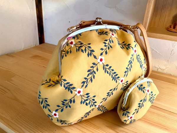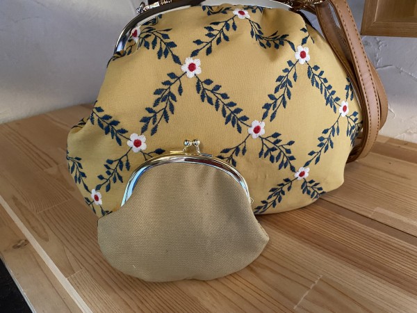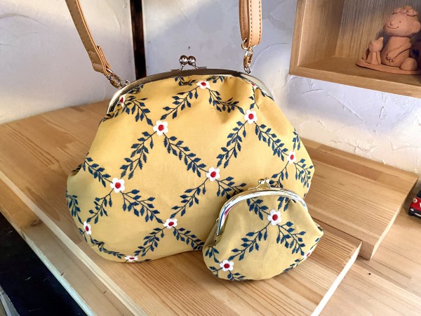 刺繍生地でまんまるで大容量のショルダーバックを作りました。500のペットボトルも長財布もすっぽりはいっちゃいます。片手であけられる。ショルダーは両手があくので安全です。