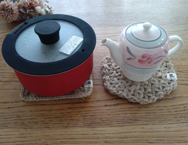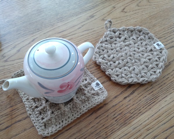 | 余ってる麻紐で鍋敷きを3種類編みました。 あと1つくらいは編めそうです。 ワッフル編みとお花を敷き詰めたようなリフ編みの模様編みは厚みがあるので一枚仕立てで、グラニースクエア模様は2枚合わせて分厚くしました。 17センチ四方程あるなで、お鍋も置けちゃいます。 麻紐は熱にも水にも強いので重宝しそう。 |