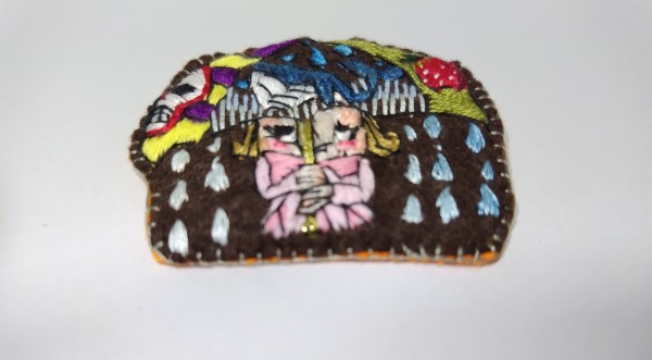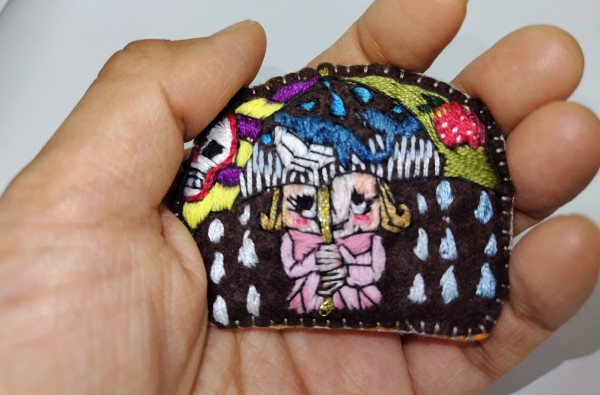 傘をさす女の子のイラストのブローチです。傘には色んな刺繍がしてあり面白いです。