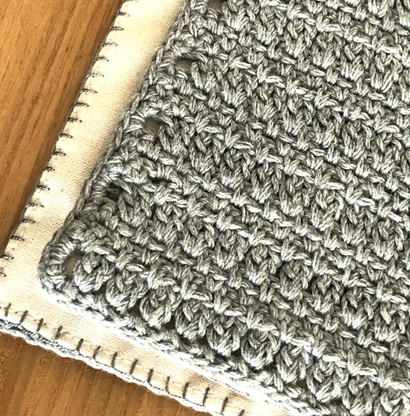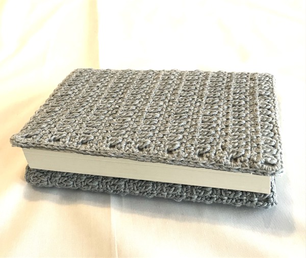 文庫本用のブックカバーです。外側はかぎ針編みの編地、グレー一色で地味ですが、V字編みや細編みを組み合わせた地模様です。