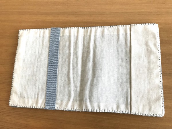 内側は綿の布地に布テープを縫い付け、ブランケットステッチで編地と縫い合わせています。
