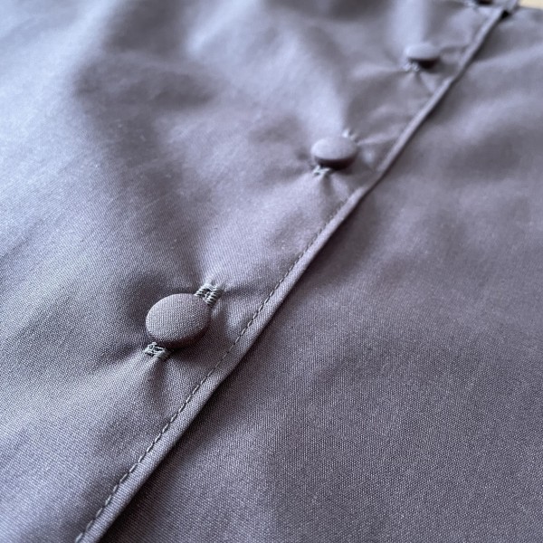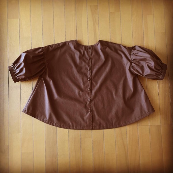 | 『シンプルで着やすいまいにち服』から、五分パフスリーブのフレアブラウスを縫いました。 チョコレート色の綿ポリ生地で、ややハリがあります。 ギャザーがきれいに出て、パフスリーブの形もきれい! ただちょっと縫い縮みしやすかったかも。。 後ろボタンは迷いましたが、共布でくるみボタンを作りました。 |