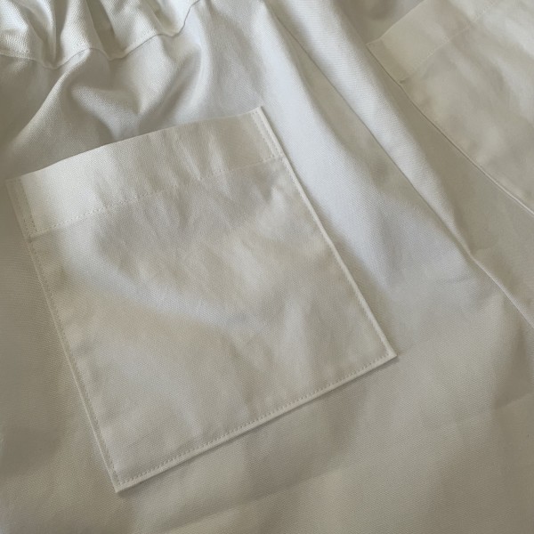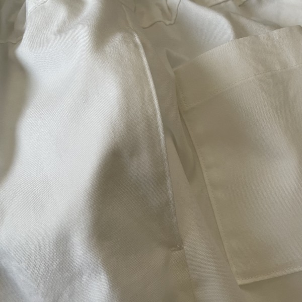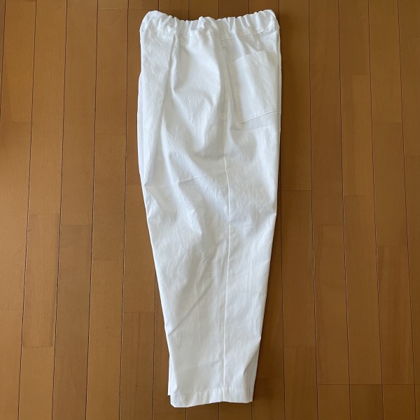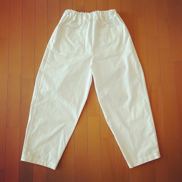 | 『ラクしてきれいに見える服』(関あや乃さん)から、タックパンツを縫いました。 真っ白のオックスで固めの生地だったので、タックによるふくらみがきれいに出て、脚の線を拾いません。 ややポケットが透けて見えるけど、主にワンピースの下に履きたいのでOKです。 ベルト部分は、元のパターンプラス2㎝の厚み(半分に折るので出来上がりは元のパターンプラス1㎝)にしました。 |