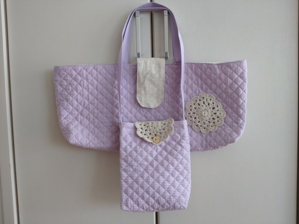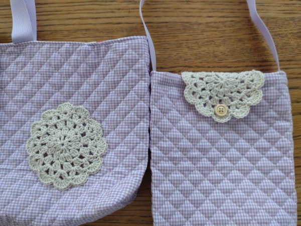 シンプルなチェックのキルティングを使ったので、コットンの糸でモチーフを編んで飾りにつけました。