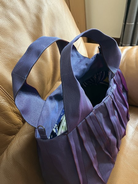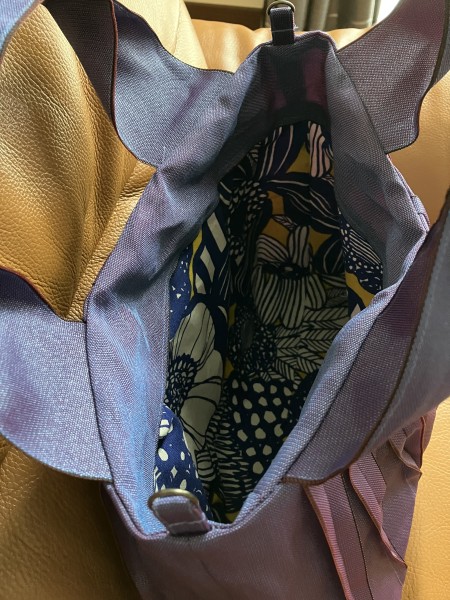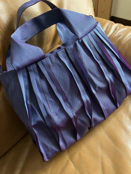 赤と紫の糸で織られたへり、角度によって色の見え方が変わり素敵。今回は内袋を付けてみました。
