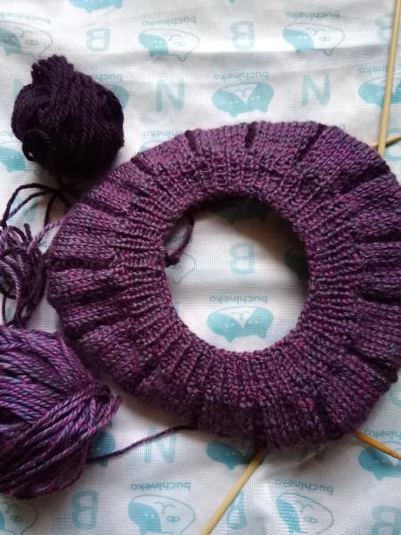 1度完成して糸始末までしたのに、ゴム編みの緩さと見た目の悪さが気になり、全部ほどいて編み直している