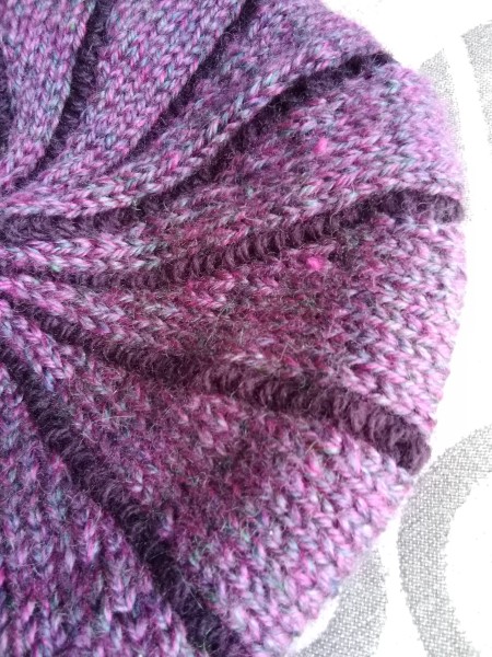 以前より編んでみたかった帽子、裏編みの縦じまが入っている