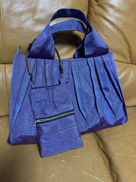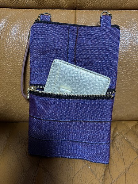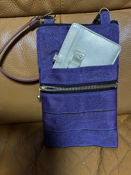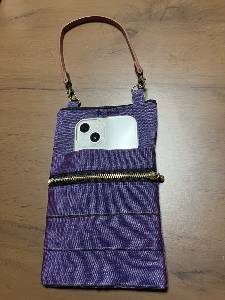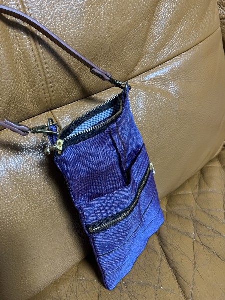 スマホショルダー。畳へりの余りで作成。外ポケットも2つ付けて、パスケースや小銭も入ります。バッグと組み合わせて小分けに便利です。