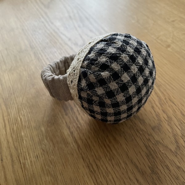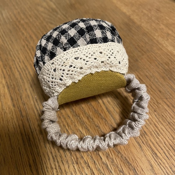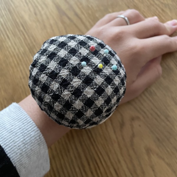 ハギレを使って、腕に付けられるタイプのピンクッションを作りました。