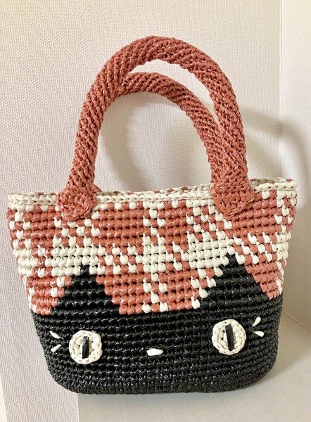 ビニールテープで編んだ黒猫のお顔をモチーフにしたバッグです。今度はチェック柄にしてみました。 内袋付きでしっかりしていて、物がたくさん入ります^ ^