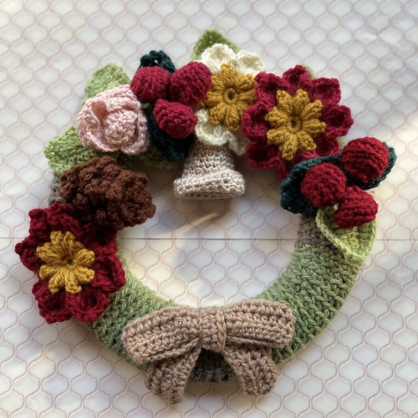 クリスマスリースをあんでみたくて挑戦しました。 お花、ひいらぎ、松ぼっくり、葉っぱなどなど。 いろいろなパーツの編み図を探して作ってみました