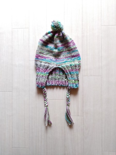 耳当て付き帽子の改良版を編みました。 ねじり一目ゴム編み→ガーター編み 三つ編みを太くしました。