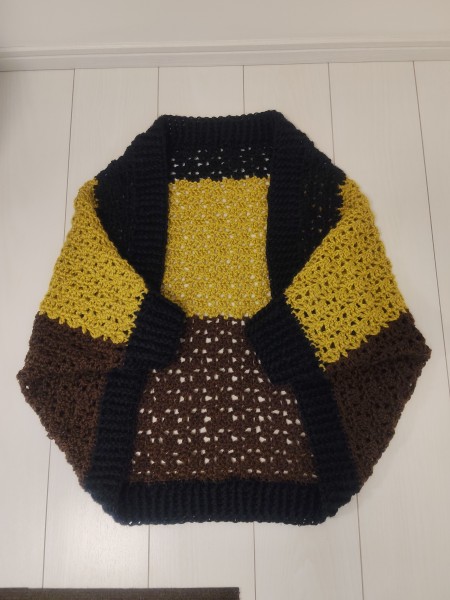 四角編みのゆったりカーディガン2着編みました。私用と母用です。黙々と編み込んで行くだけなのですごく簡単。私用は少し大きめなのでボタンを付けてズレて落ちないようにしました。