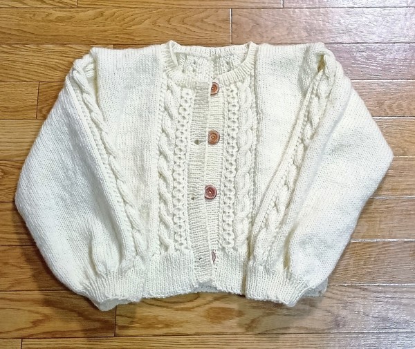 アランカーディガンです。 大変だったけどサイズもちょうど良く出来上がりました。